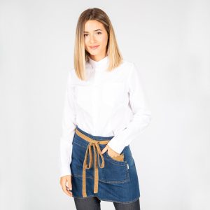 DELANTAL CORTO LAVADO TEJANO AÑIL COMBI MOSTAZA 40X69 CM «RED LINE».Tiras para anudar en costados. 3 bolsillos en delantero. Largo aprox.: 40 cm.