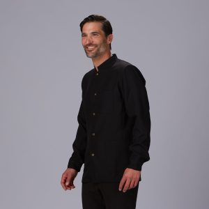 CHAQUETA COCINA UNISEX POPELIN FINO NEGRO M/C.Botones de pastilla. Bolsillo en pecho izquierdo. Largo aprox.: 72 cm. Prenda H2: semi ajustada