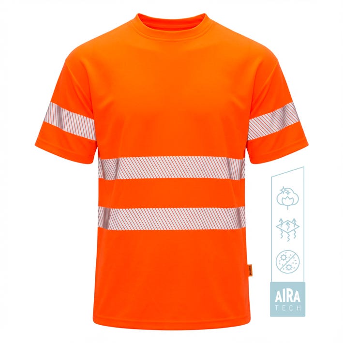 Camiseta de manga corta de alta visibilidad monocolor en fluor. Confeccionado con tejido técnico punto liso que facilita la transpiración y tiene mejor respuesta en enganchones. La prenda dispone de tejido de malla en las axilas lo cuál ayuda a la evaporación rápida del sudor. El cuello está confeccionado en tejido de canalé en el mismo color de contraste que el resto de la prenda. Bandas reflectantes segmentadas de color gris/plata que rodean el torso. Lavado a temperatura máxima 40º – Se puede planchar maximo 170°C -No usar lejía – No permite limpieza en seco – No utilizar secadora – Max 25X.
