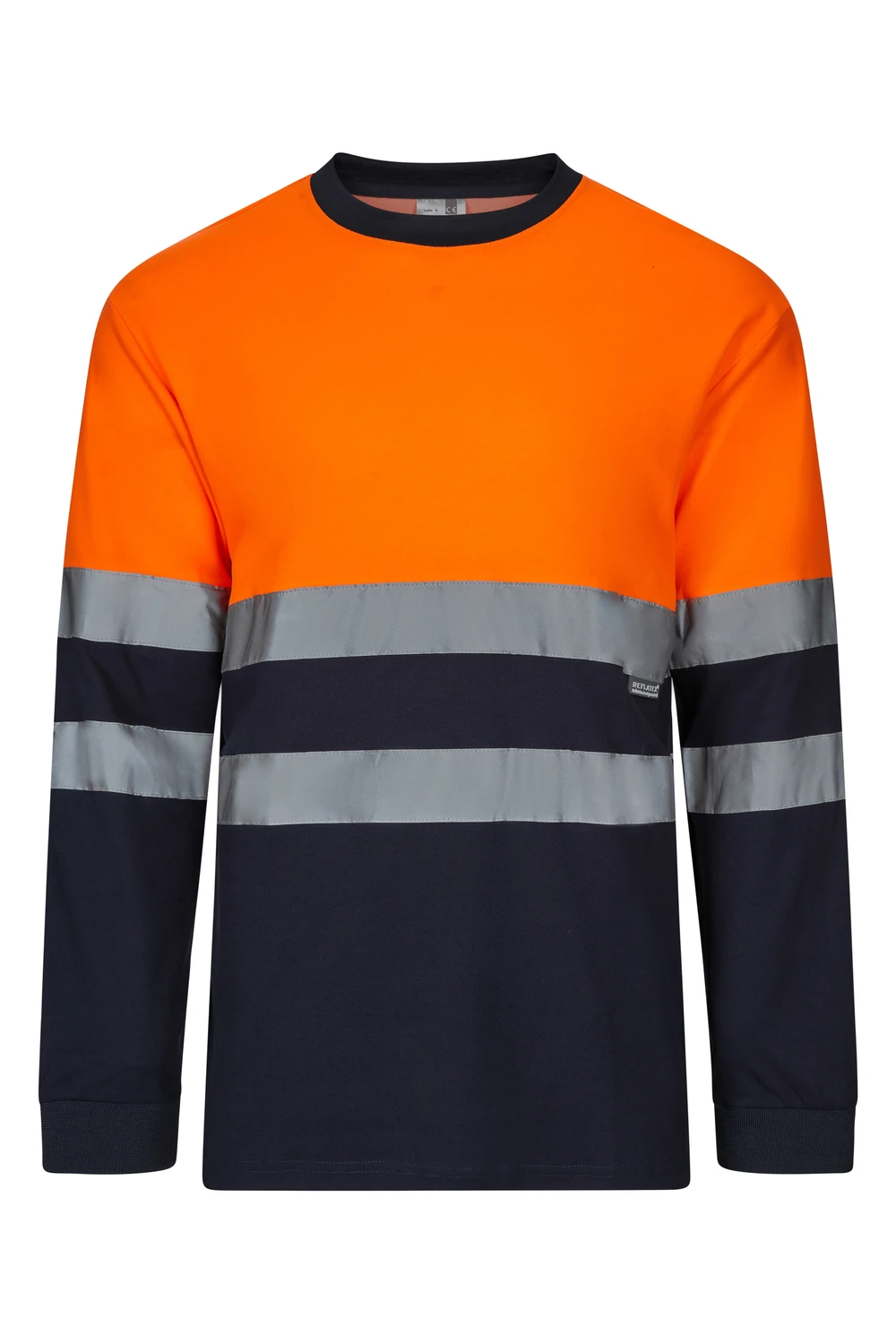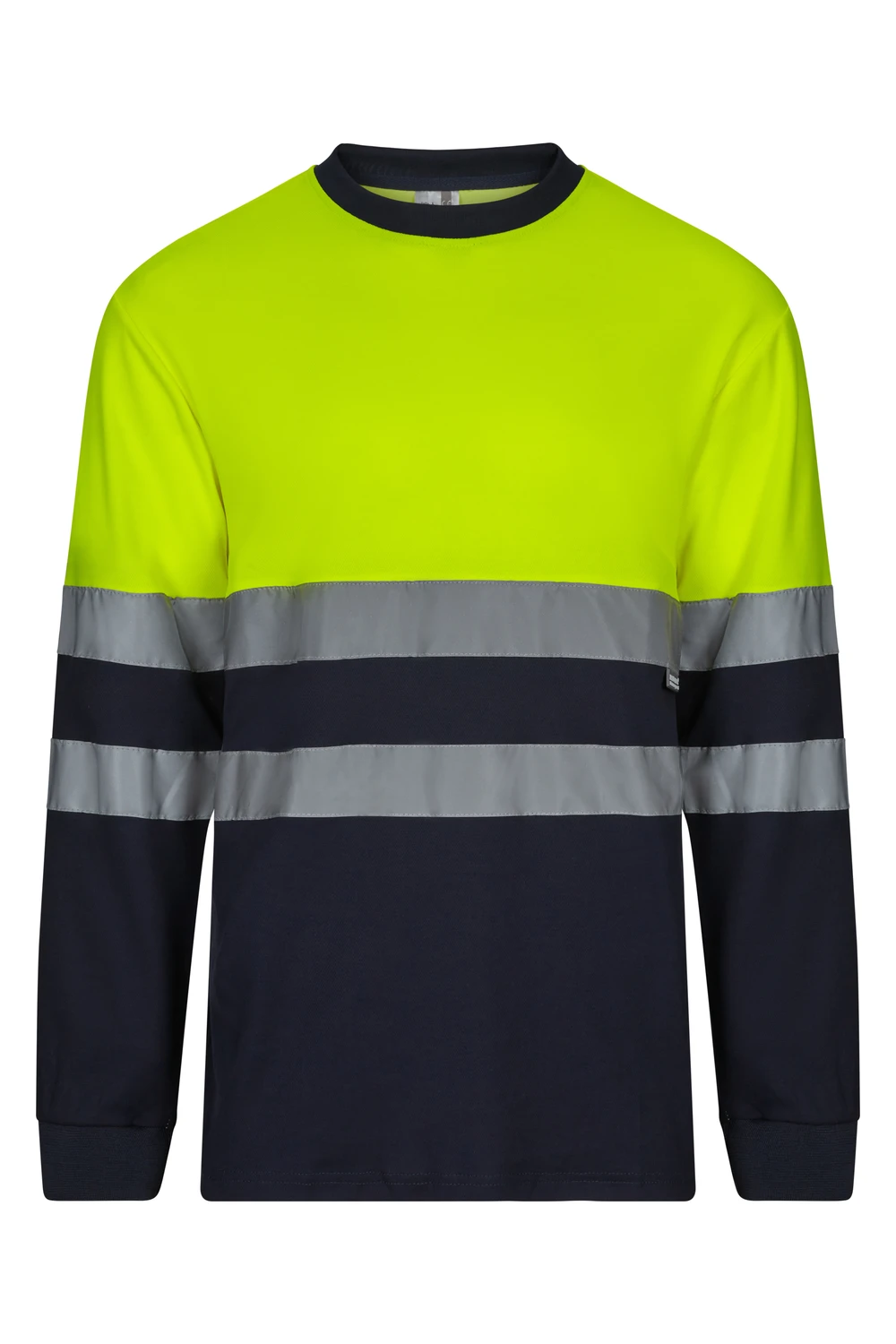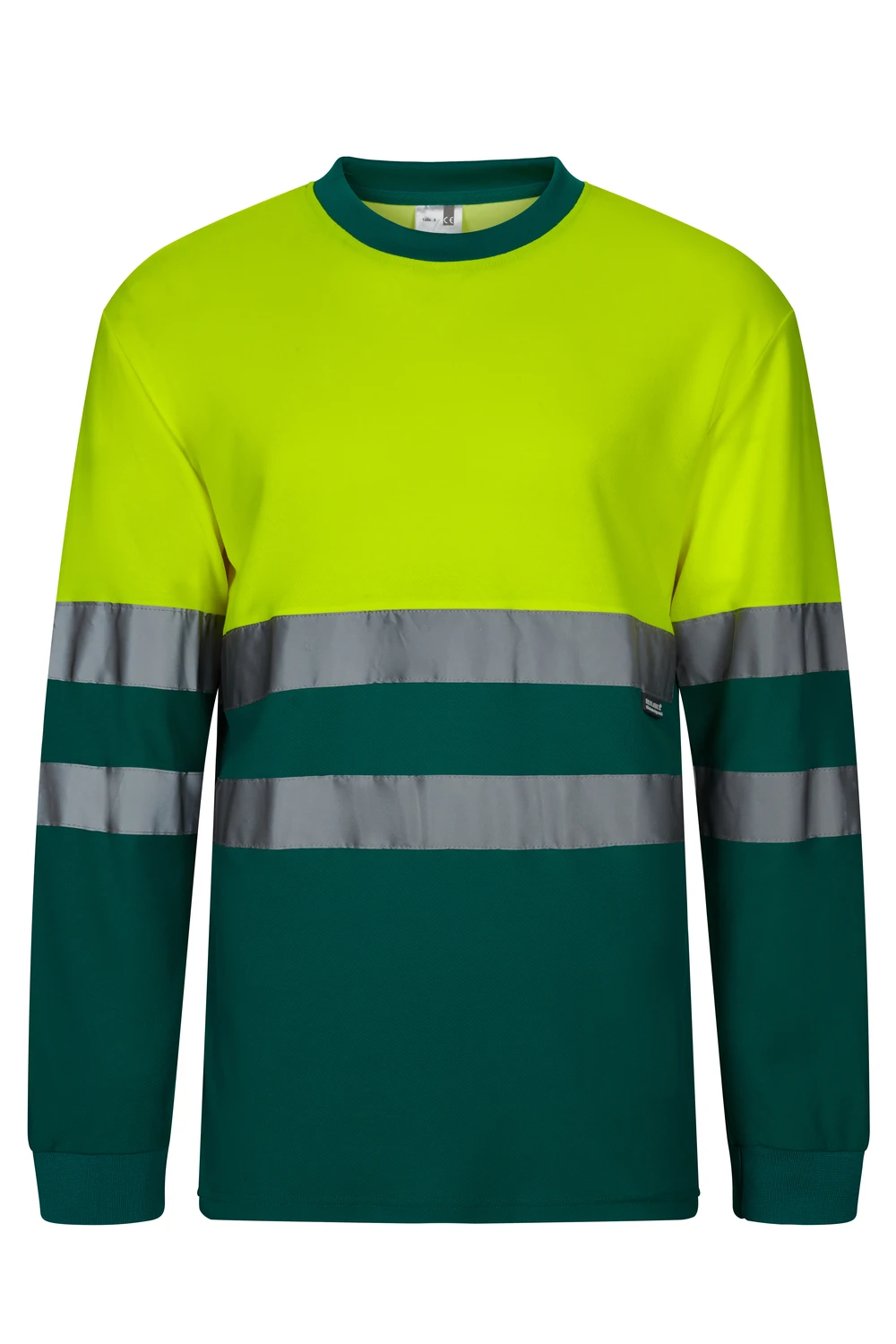 Cuello redondo de canalé, en color contrasteCubrecosturas con cinta de espigaCintas reflectantes en torso y mangasPuños de canalé