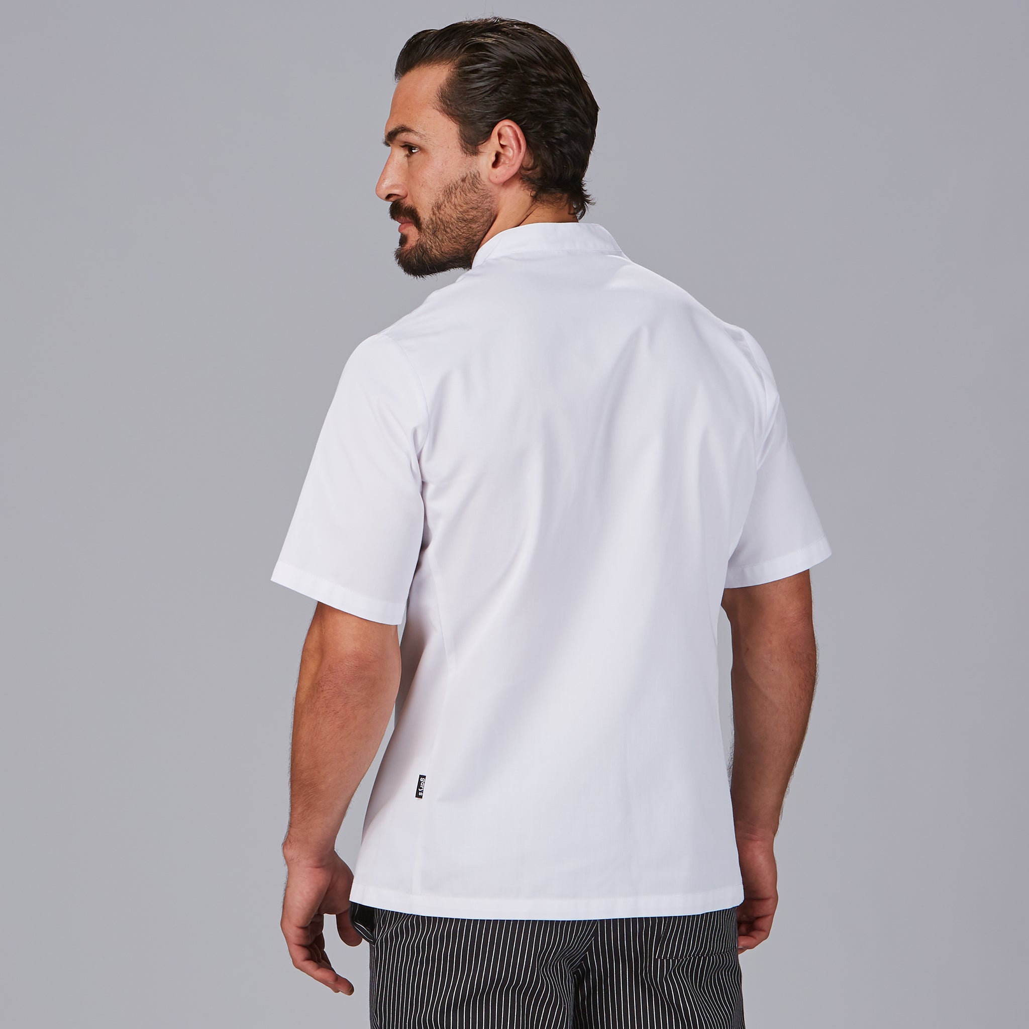 CHAQUETA COCINA UNISEX LUQUE M/C.Botones de presión vistos. Bolsillo en manga izquierda. Manga corta. Largo aprox.: 73 cm. Prenda H2: semi ajustada.