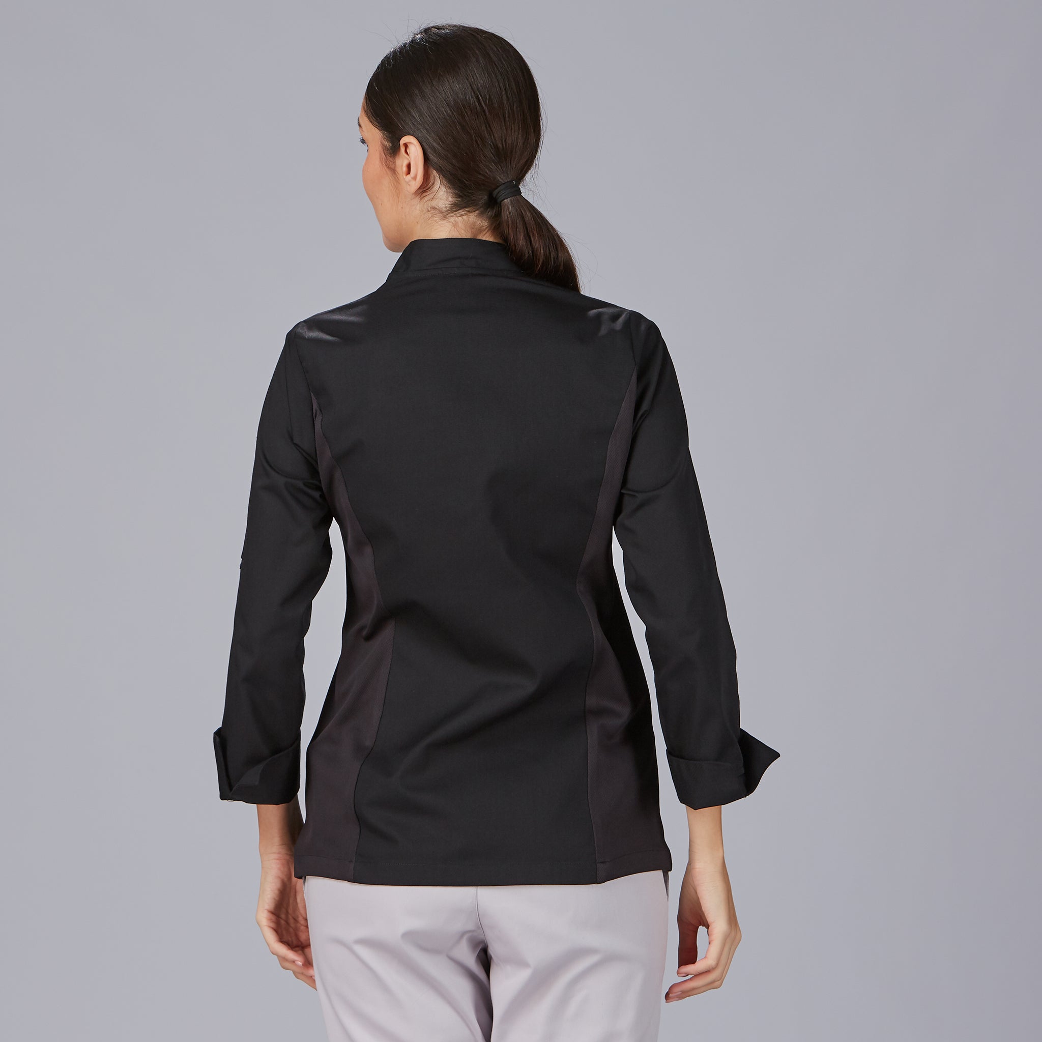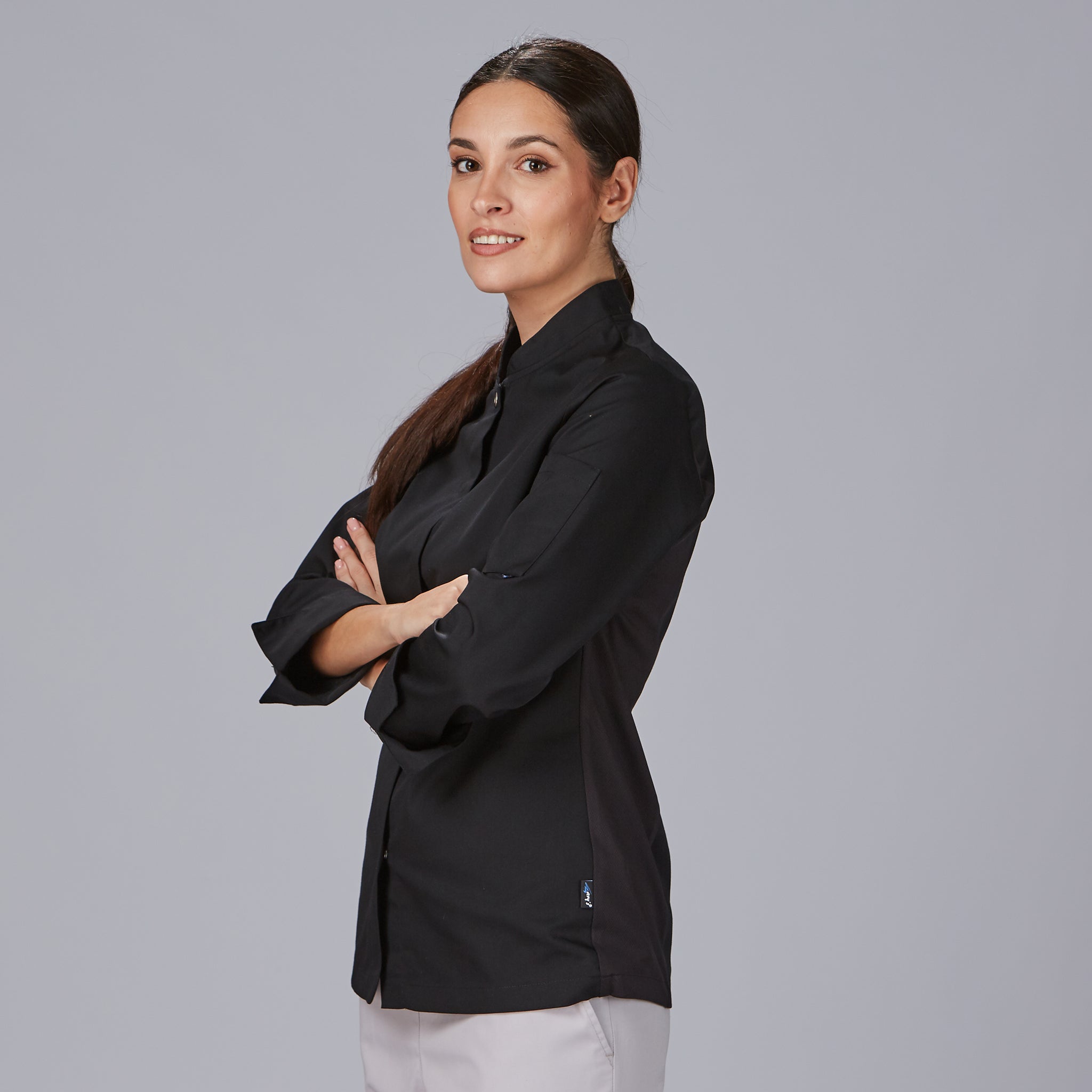 CHAQUETA COCINA UNISEX POPELIN FINO NEGRO M/C.Botones de pastilla. Bolsillo en pecho izquierdo. Largo aprox.: 72 cm. Prenda H2: semi ajustada