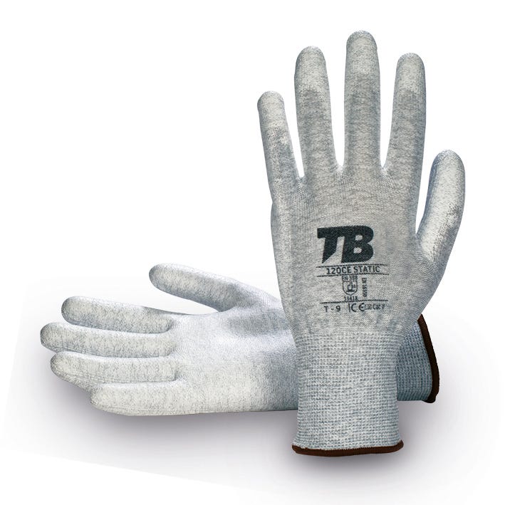 Guante poliéster y fibra de carbono gris sin costuras. Recubrimiento poliuretano blanco en palma. Puño elástico. Galga 13. Resistividad vertical=10^6 Ohm.120CE STATIC