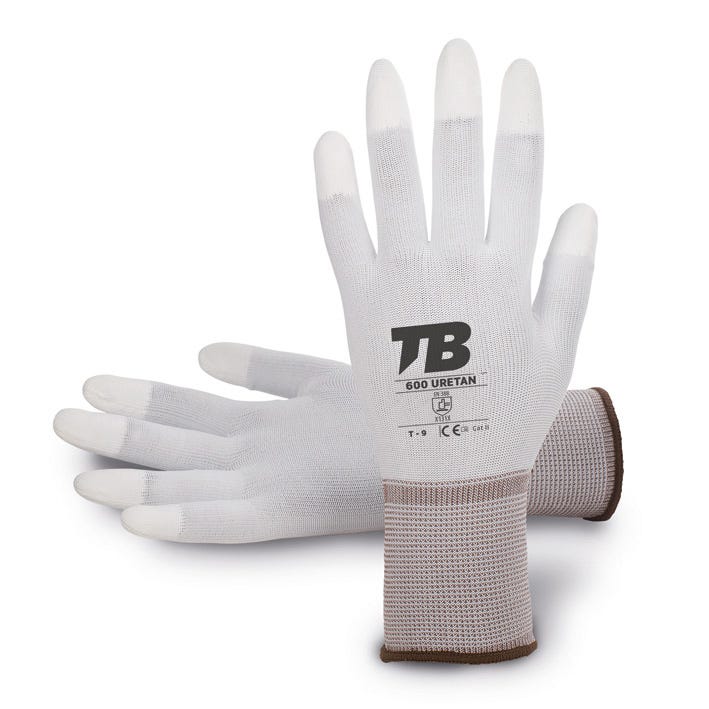Guante soporte nailon blanco sin costuras. Recubrimiento poliuretano blanco en puntas dedos. Puño elástico. Galga 13