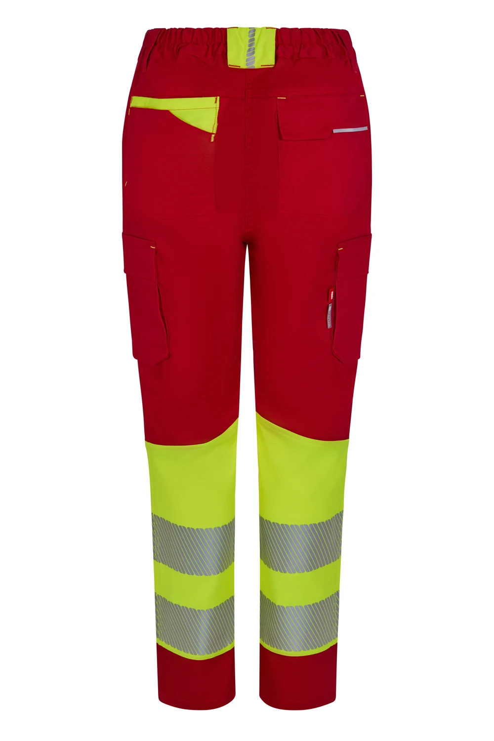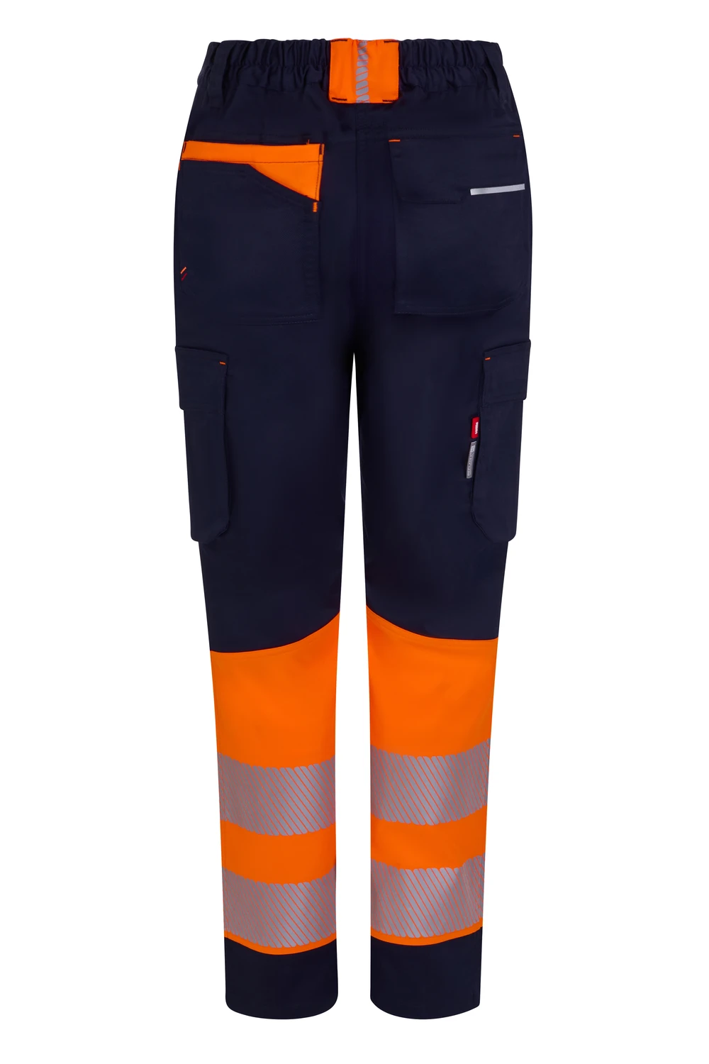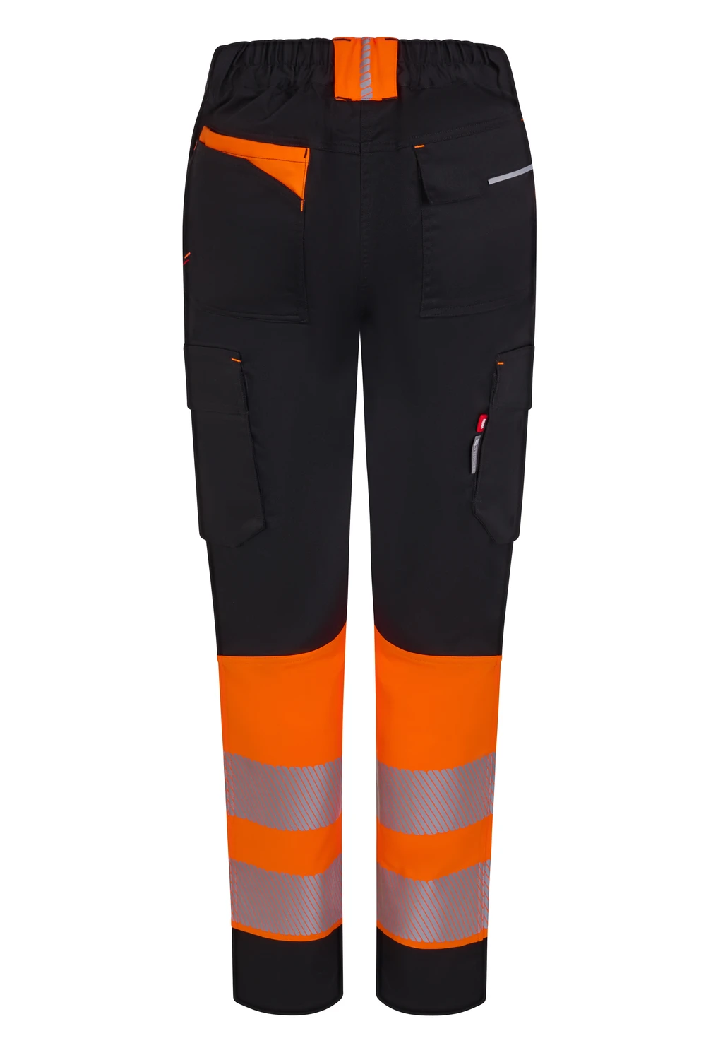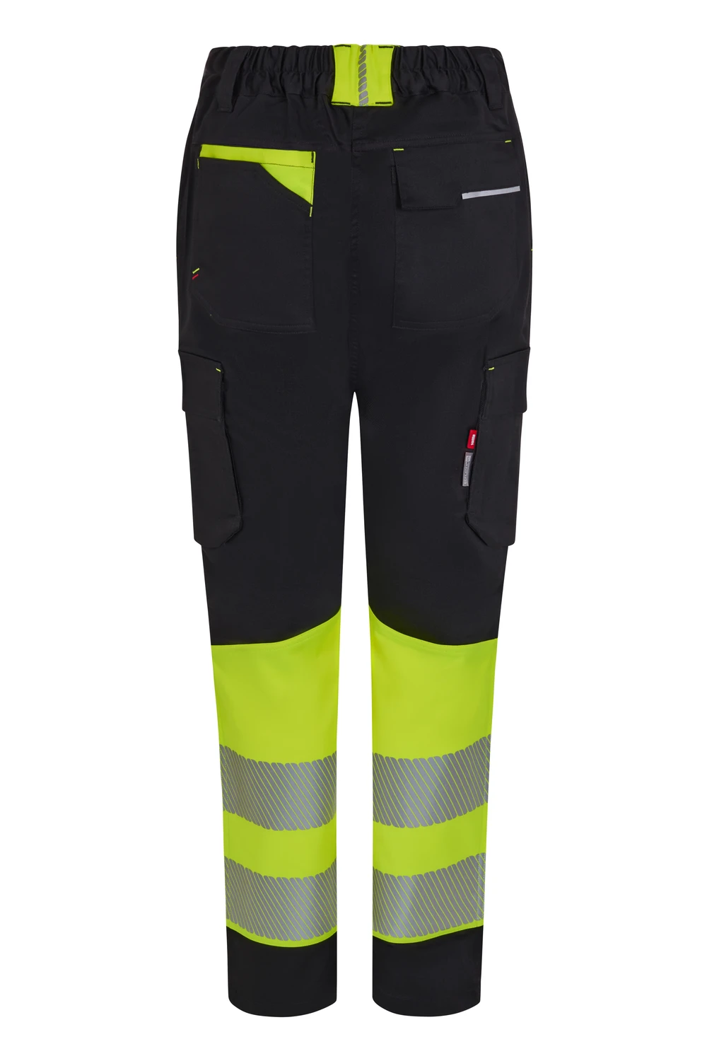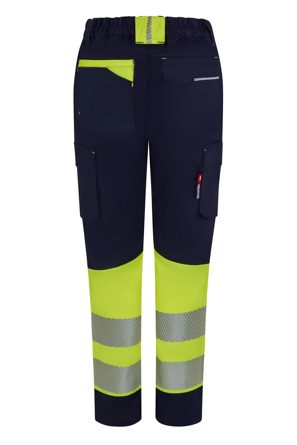 Corte slim fit Canesú trasero Cierre central con cremallera y botón personalizado Cintas reflectantes segmentadas termofijadas en el bajo del pantalón Detalles reflectantes y en color flúor en presillas, bolsillos y trabilla trasera asimétrica Cinturilla trasera elástica ergonómica Doble costura de seguridad Siete bolsillos: 2 bolsillos franceses; 2 bolsillos laterales con fuelle inferior y tapeta, de fácil acceso; 1 bolsillo trasero de parche con tapeta asimétrica, velcro y vivo reflectante y 1 doble bolsillo trasero de parche, sin tapeta, con 1 bolsillo asimétrico con velcro