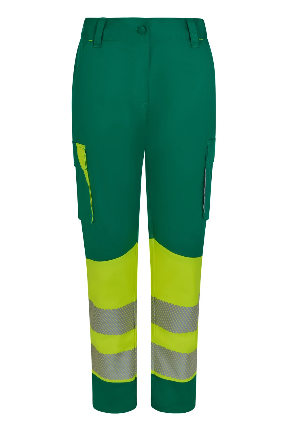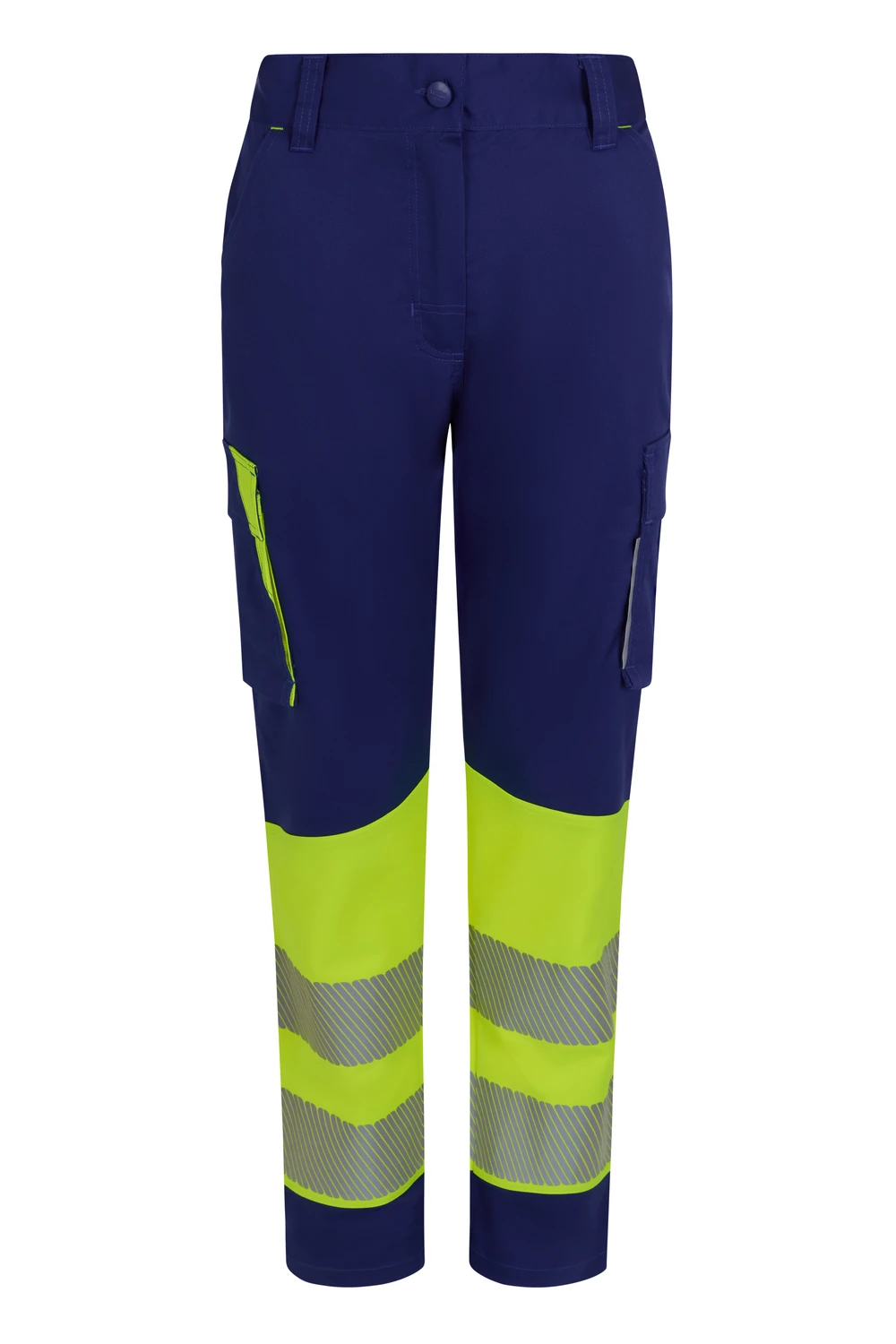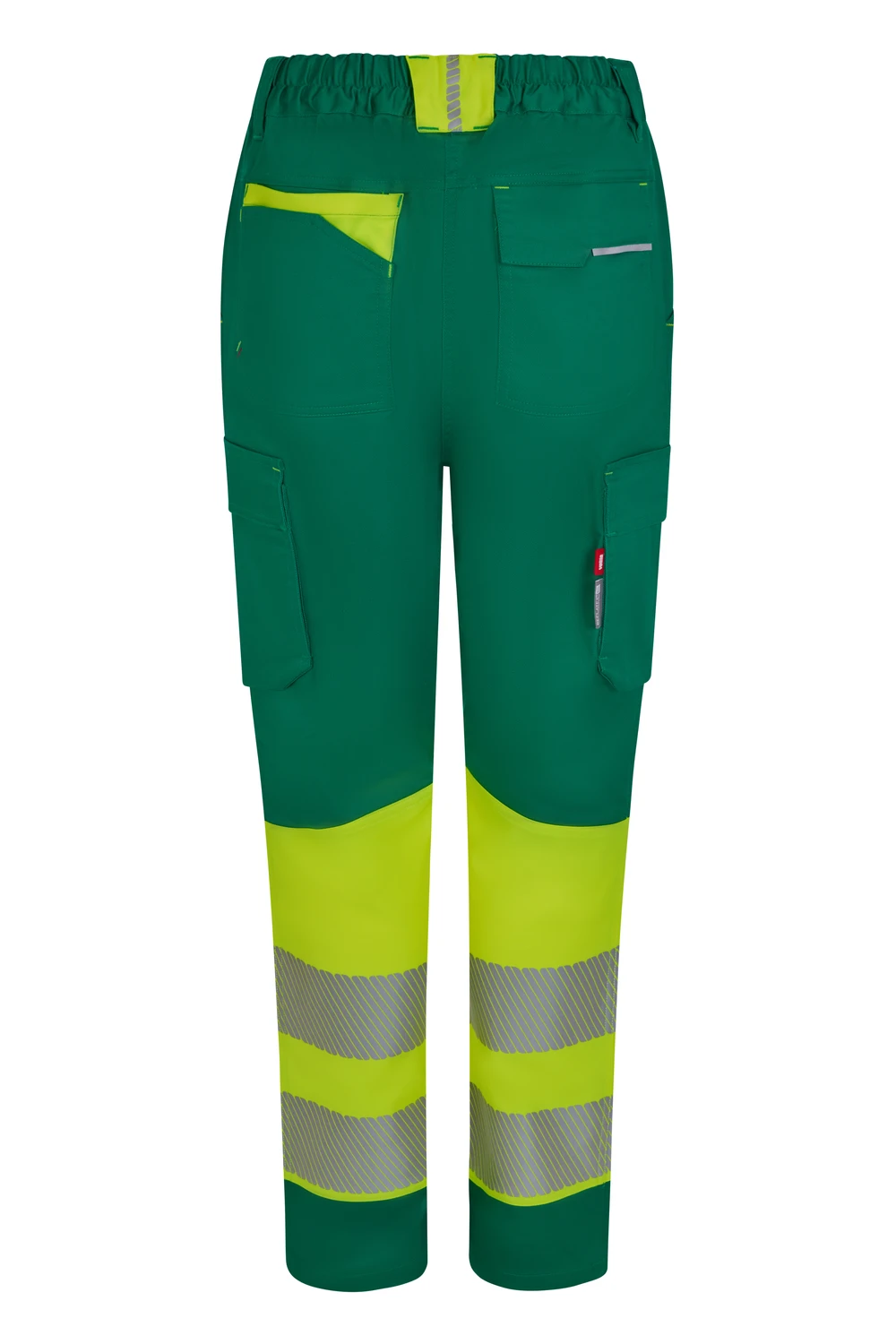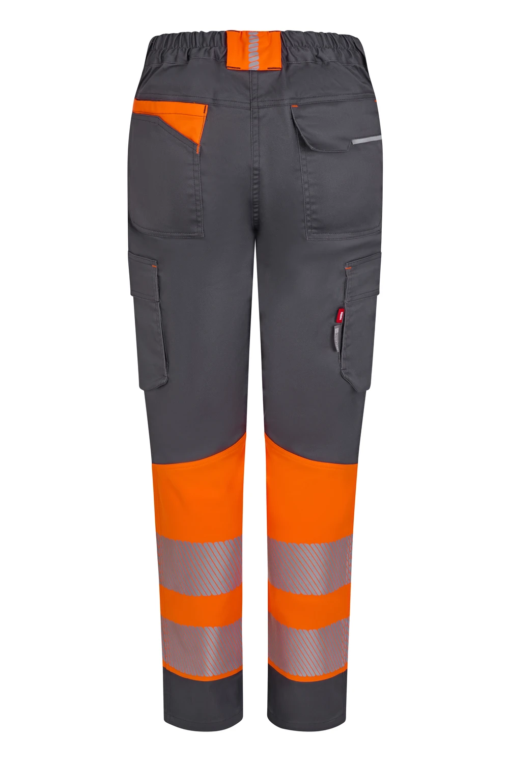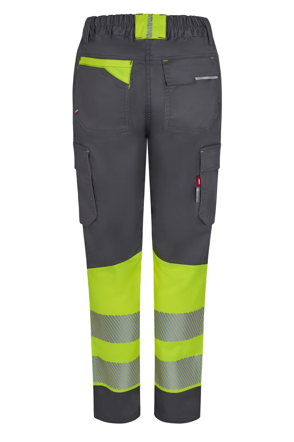 Corte slim fit Canesú trasero Cierre central con cremallera y botón personalizado Cintas reflectantes segmentadas termofijadas en el bajo del pantalón Detalles reflectantes y en color flúor en presillas, bolsillos y trabilla trasera asimétrica Cinturilla trasera elástica ergonómica Doble costura de seguridad Siete bolsillos: 2 bolsillos franceses; 2 bolsillos laterales con fuelle inferior y tapeta, de fácil acceso; 1 bolsillo trasero de parche con tapeta asimétrica, velcro y vivo reflectante y 1 doble bolsillo trasero de parche, sin tapeta, con 1 bolsillo asimétrico con velcro