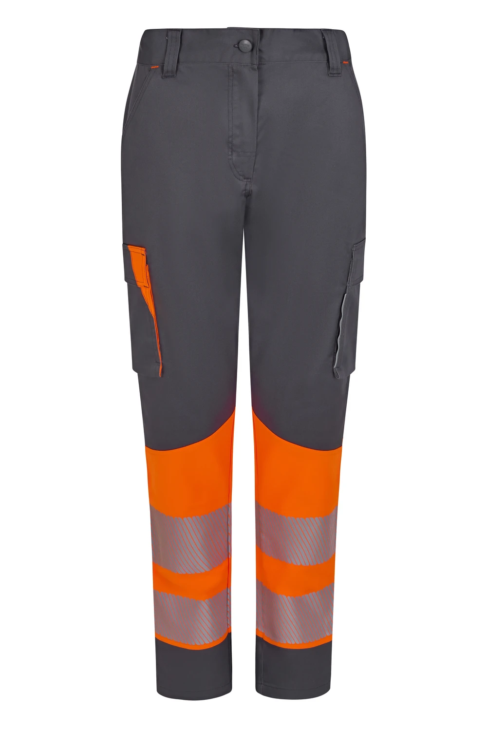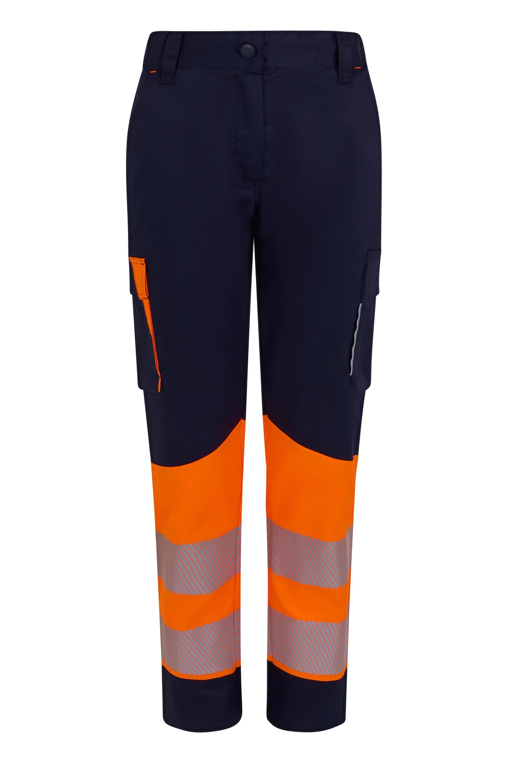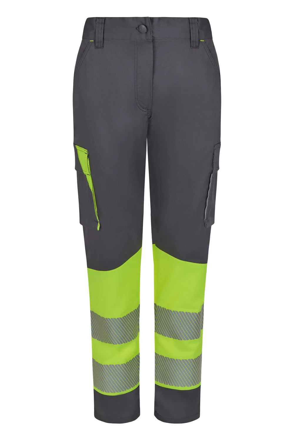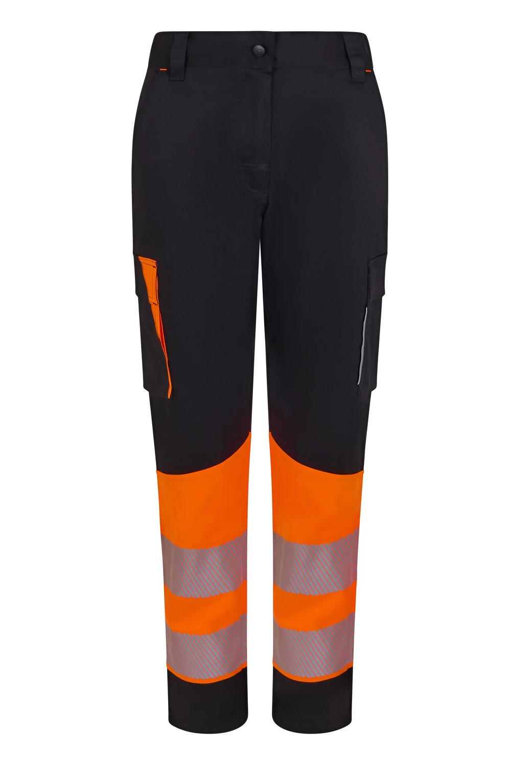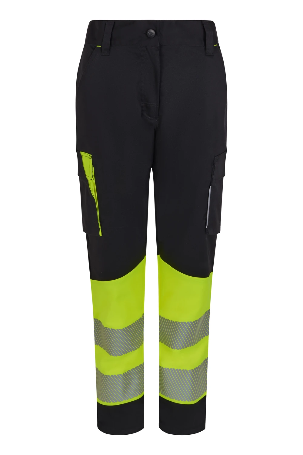 Corte slim fit Canesú trasero Cierre central con cremallera y botón personalizado Cintas reflectantes segmentadas termofijadas en el bajo del pantalón Detalles reflectantes y en color flúor en presillas, bolsillos y trabilla trasera asimétrica Cinturilla trasera elástica ergonómica Doble costura de seguridad Siete bolsillos: 2 bolsillos franceses; 2 bolsillos laterales con fuelle inferior y tapeta, de fácil acceso; 1 bolsillo trasero de parche con tapeta asimétrica, velcro y vivo reflectante y 1 doble bolsillo trasero de parche, sin tapeta, con 1 bolsillo asimétrico con velcro