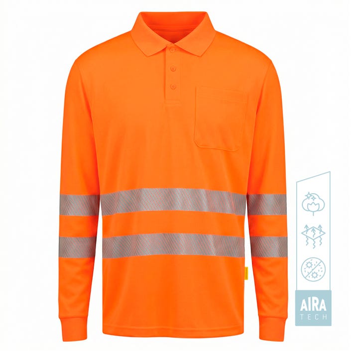 Polo de manga larga de alta visibilidad monocolor confeccionado con tejido poliéster. La prenda dispone de tejido de malla en las axilas lo cuál ayuda a la evaporación rápida del sudor. Dispone de 3 botones de plástico en el cuello. Un bosillo en el pecho con cierre por velcro. El cuello está confeccionado en tejido de canalé. Bandas reflectantes segmentadas de color gris/plata que rodean el torso y mangas. Lavado a temperatura máxima 40º – Se puede planchar maximo 170°C -No usar lejía – No permite limpieza en seco – No utilizar secadora – Max 25X.