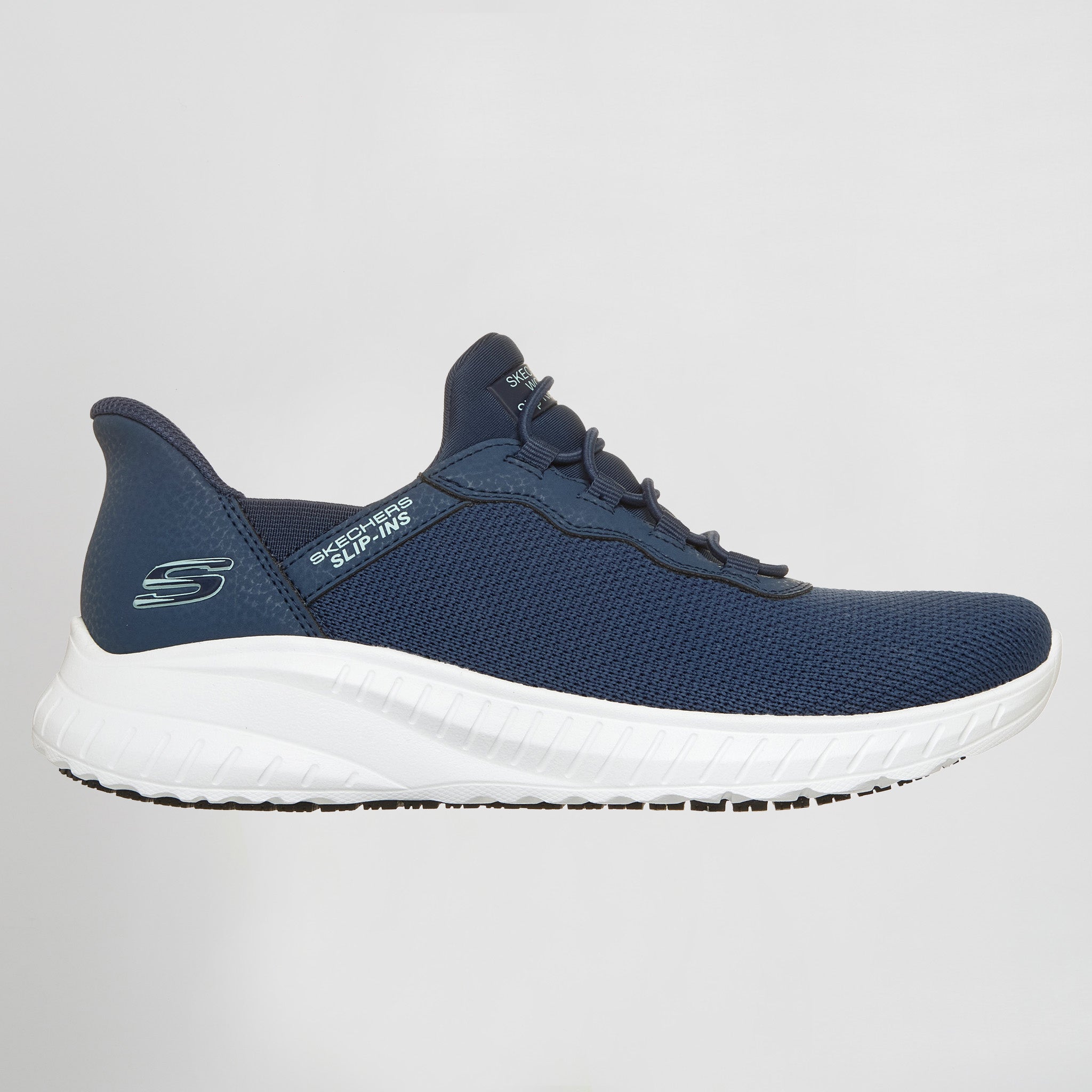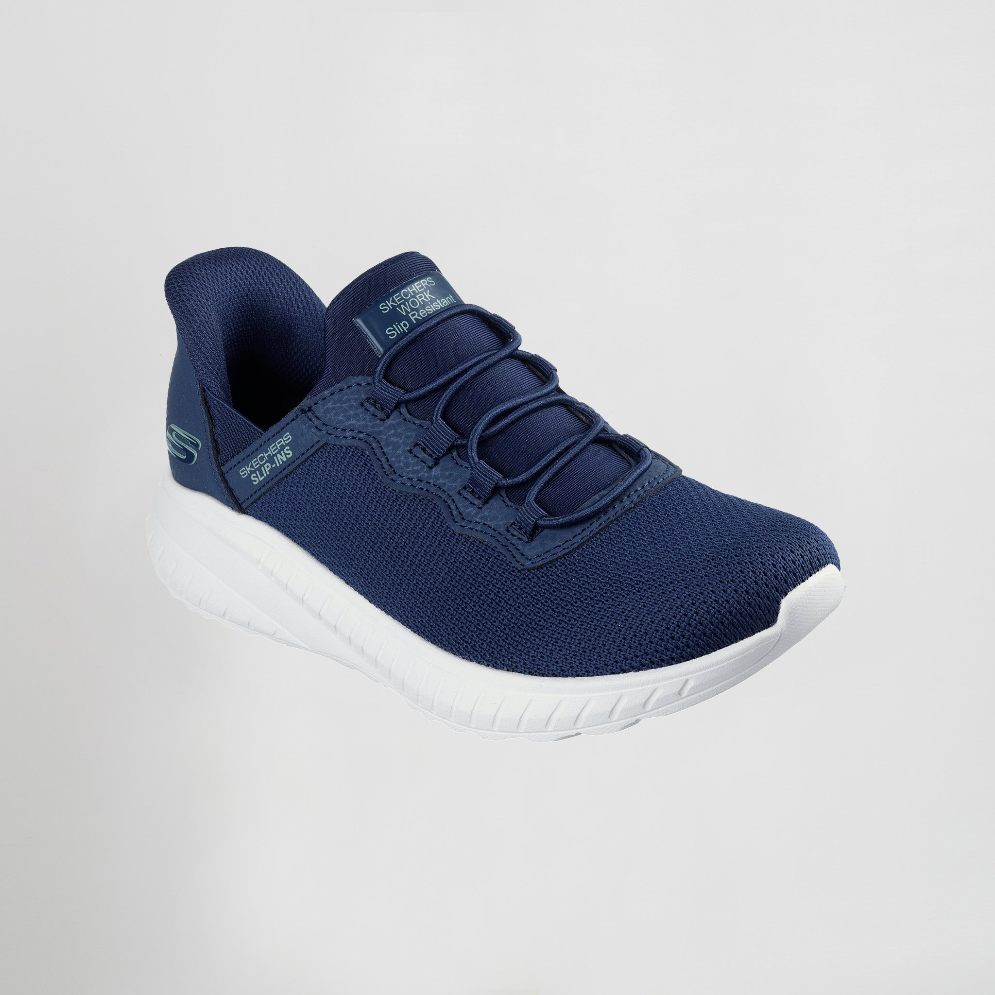 Skechers Hands Free Slip-ins® para un ajuste fácil. Heel Pillow® mantiene el pie firmemente en su sitio. Suela antideslizante (SR) para una mayor tracción en superficies húmedas, secas, aceitosas y grasientas. Plantilla acolchada Skechers Air-Cooled Memory Foam® para mayor comodidad. No Tie Fit™: los cordones nunca se desatan. Parte superior de malla y sintética con cordones elásticos. Tacón de 3,2 cm. Lavable a máquina. Detalle del logotipo de Skechers®.