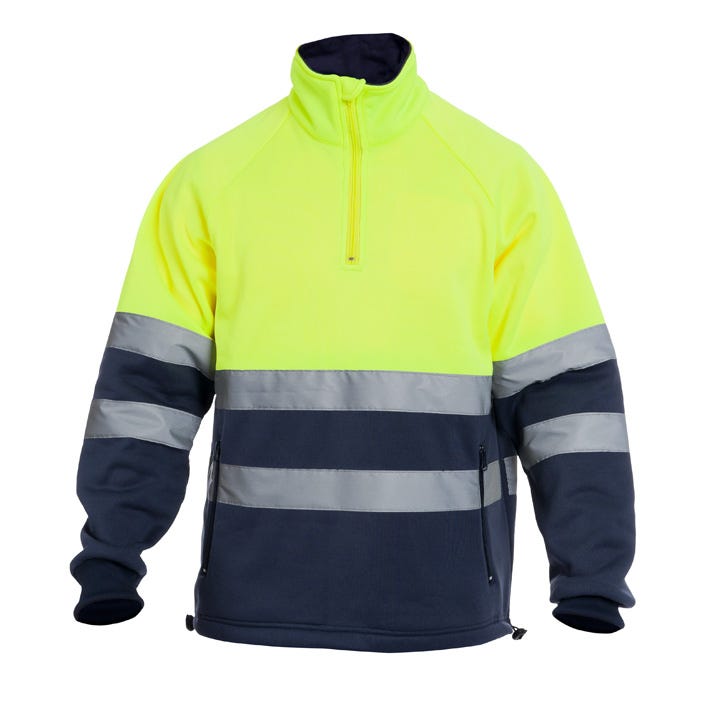Sudadera de alta visibilidad combinada en flúor y contraste. La prenda dispone de media creamallera para facilitar su uso y regular la temperatura corporal. Tiene dos bolsillos con cierre cremallera. Ajuste en cadera mediate tiradores elásticos. Cuenta co