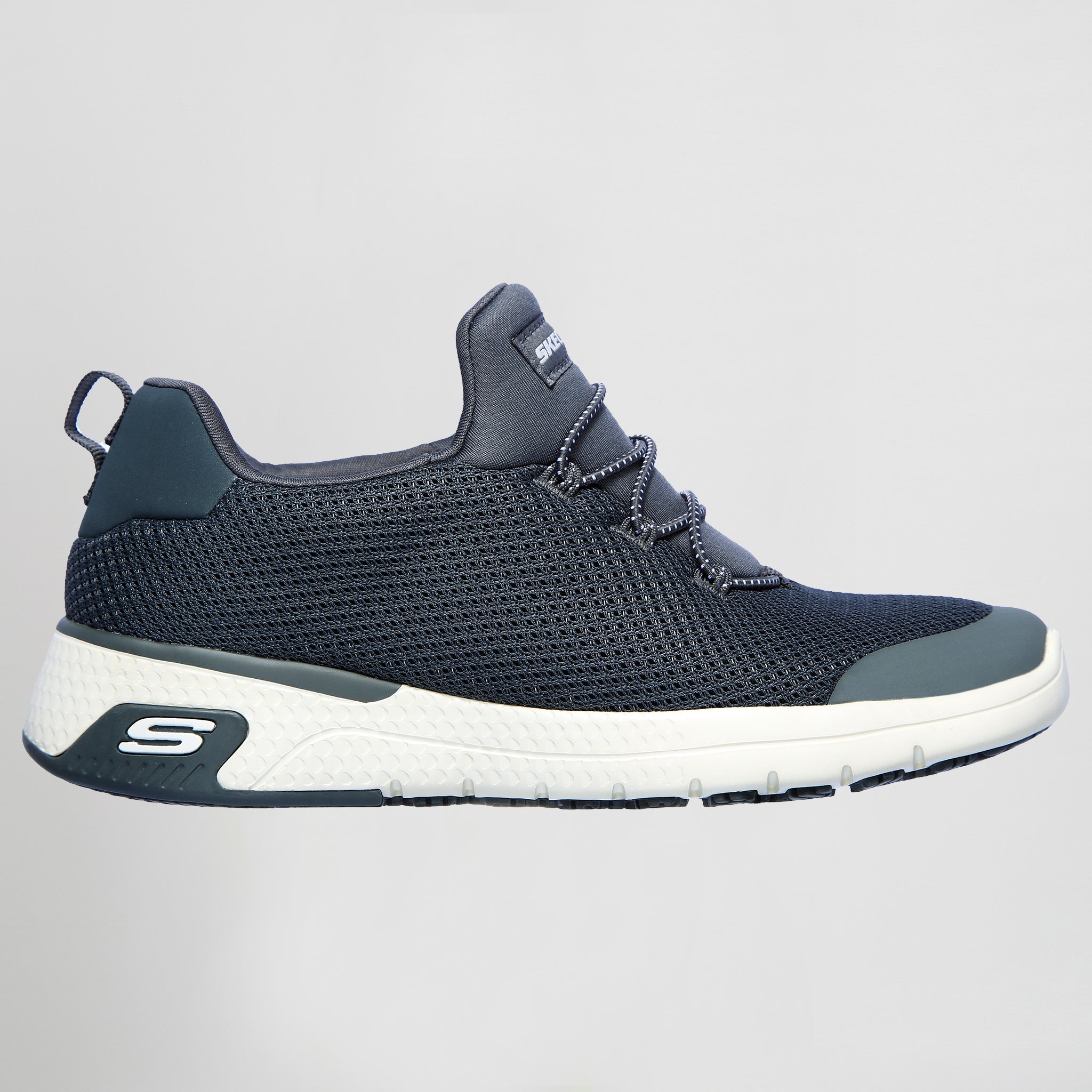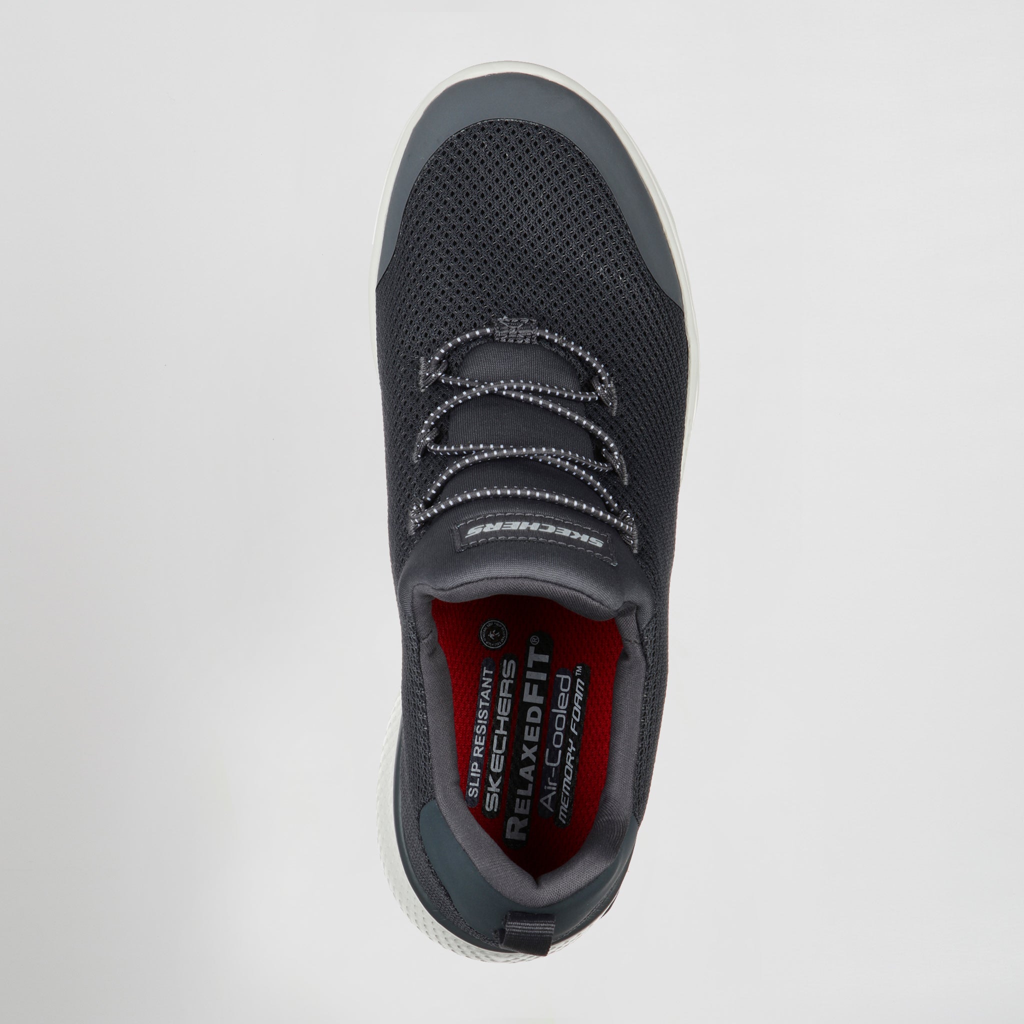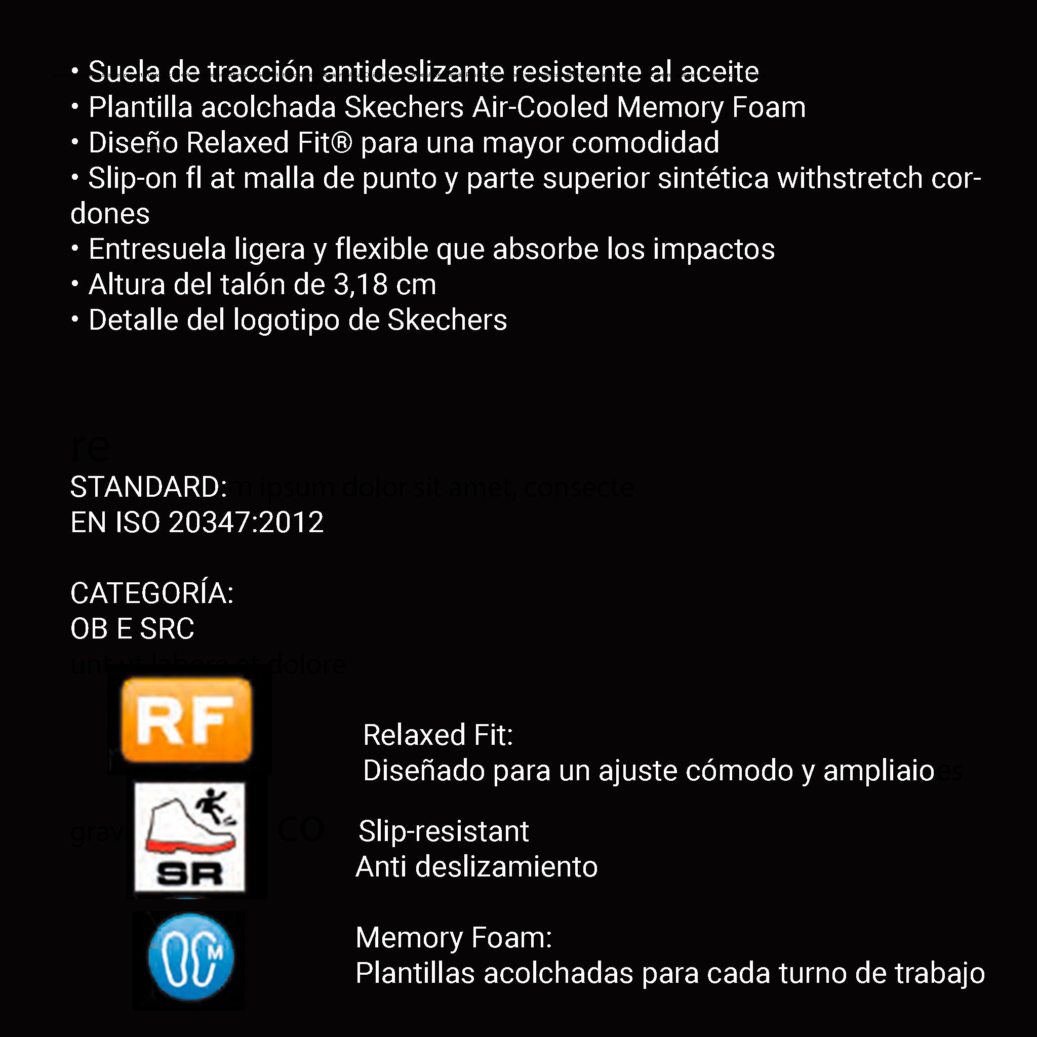 – Modelo de trabajo antideslizante con parte superior de malla y tejido sintético, cordones elásticos decorativos, suela antideslizante y plantilla Skechers Air-Cooled Memory Foam con amortiguación