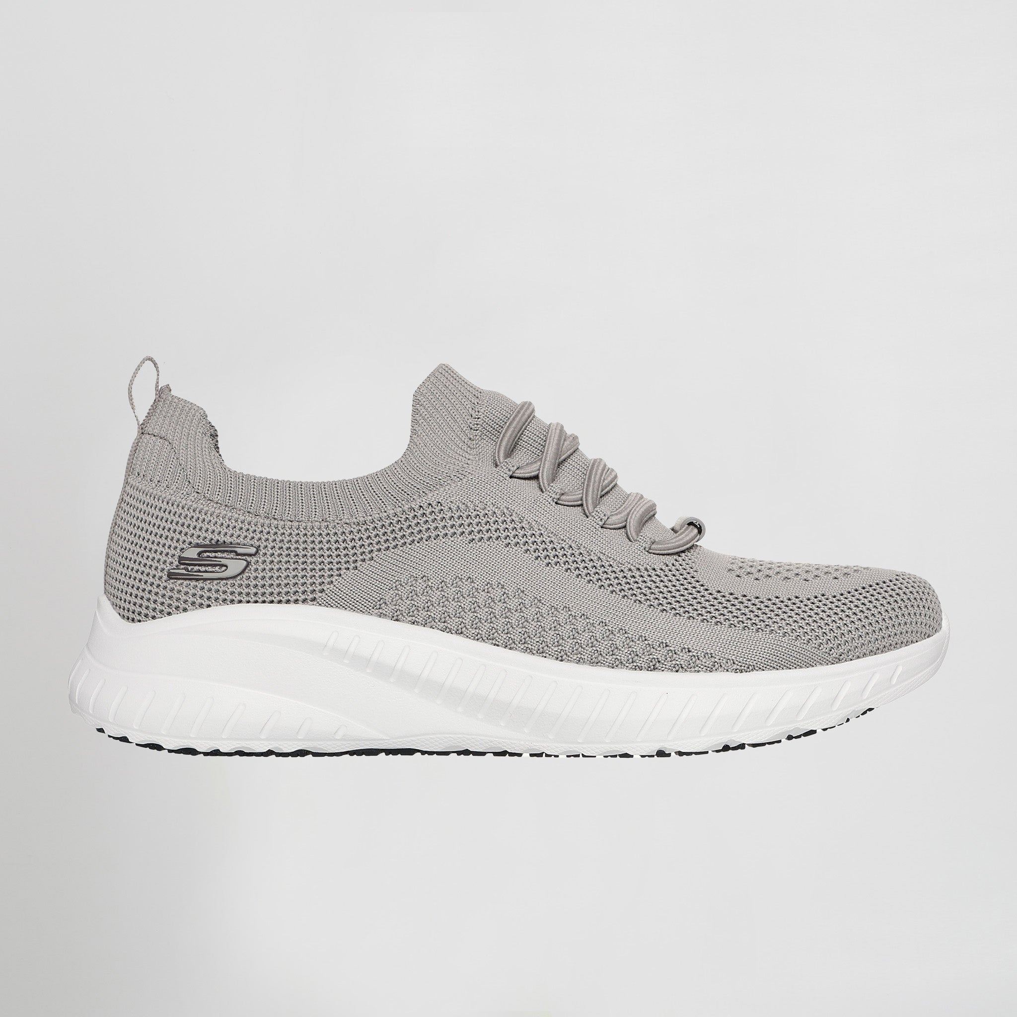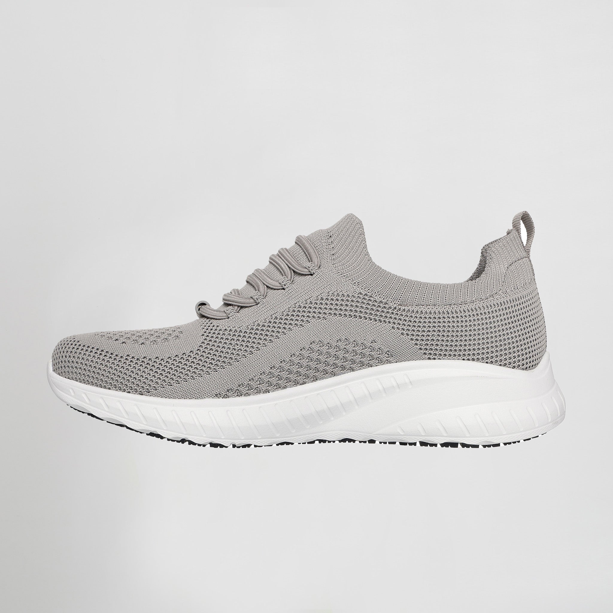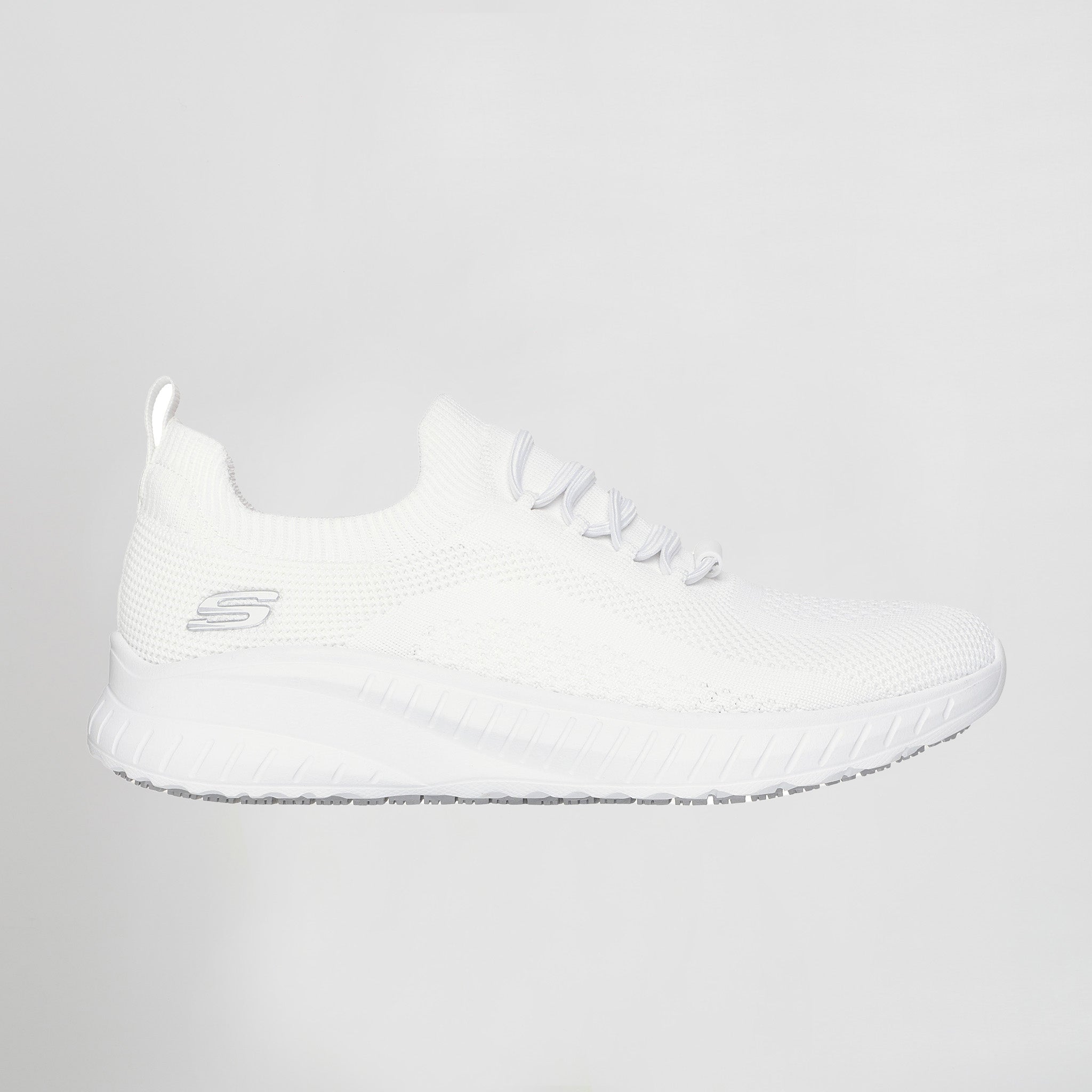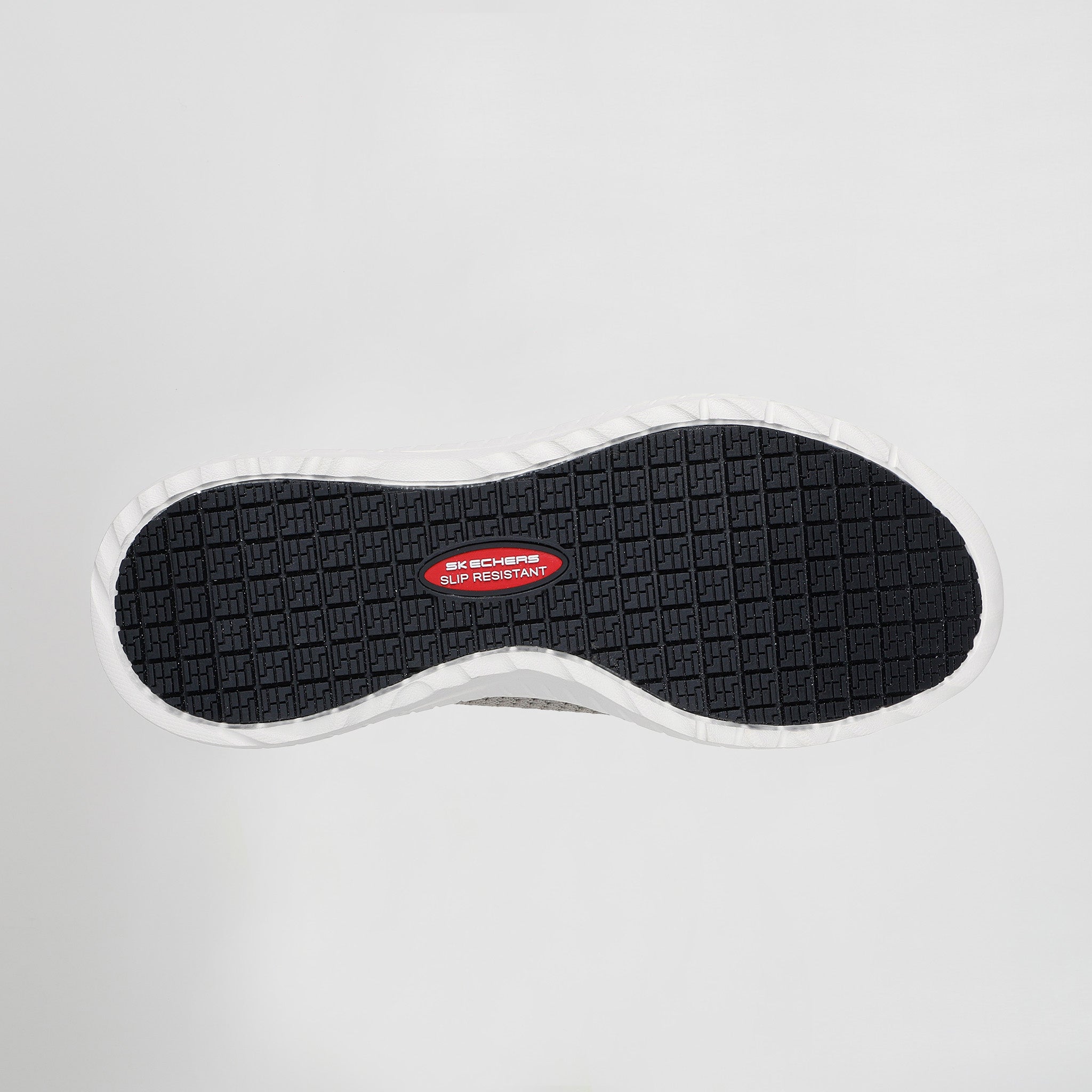 – Este cómodo modelo para el trabajo cuenta con una parte superior de malla Stretch Knit® con cordones elásticos, una plantilla acolchada Skechers Memory Foam™ y una suela flexible antideslizante con gran tracción