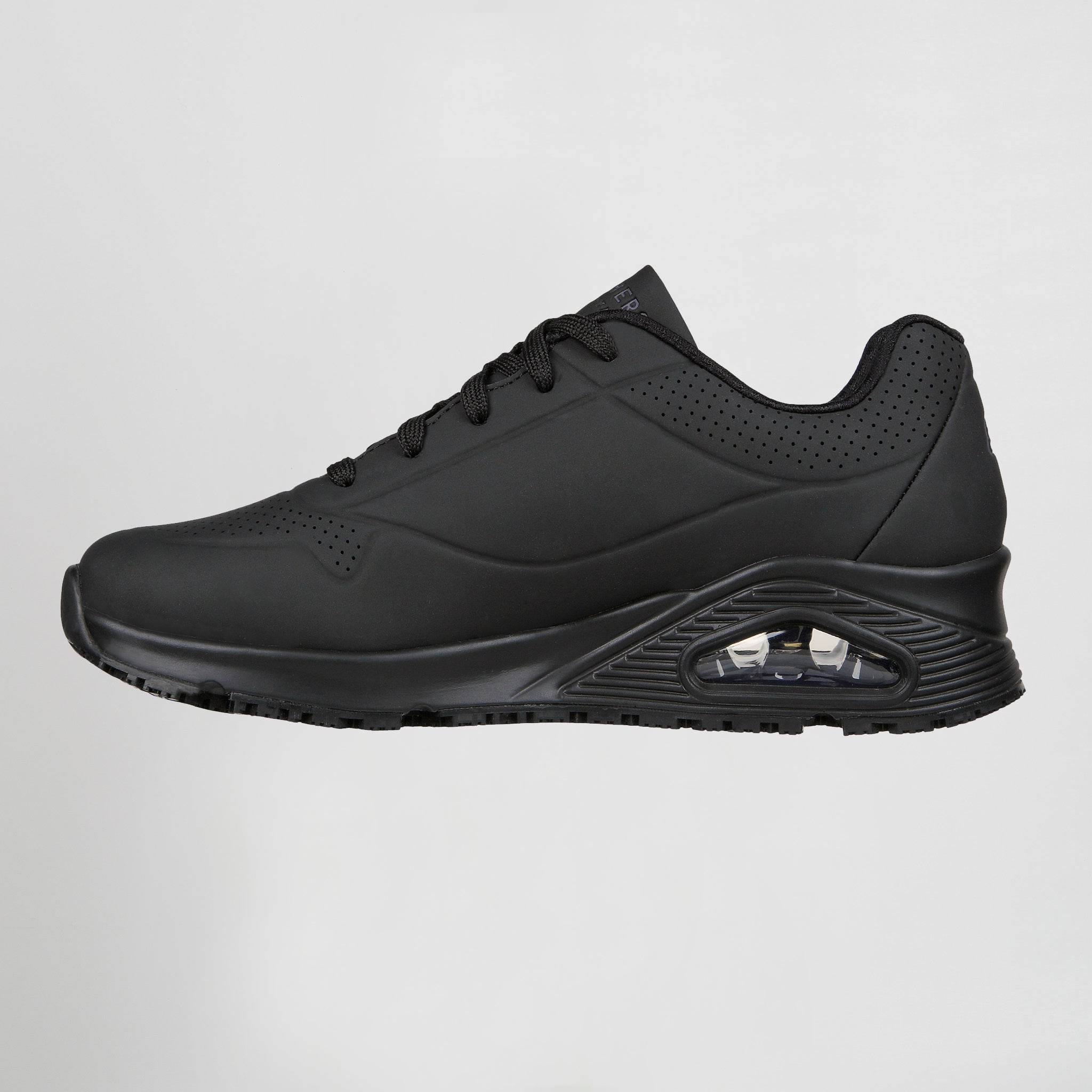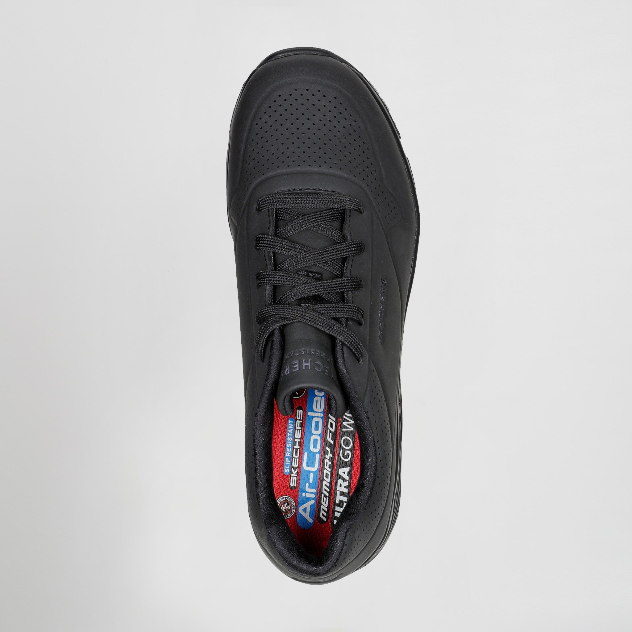 – Éste diseño de trabajo antideslizante cuenta con una parte superior duradera de «durabuck» sintético perforado, una plantilla Skechers Air-Cooled Mamory Foam y una entresuela con cámara de aire visible Skech-Air